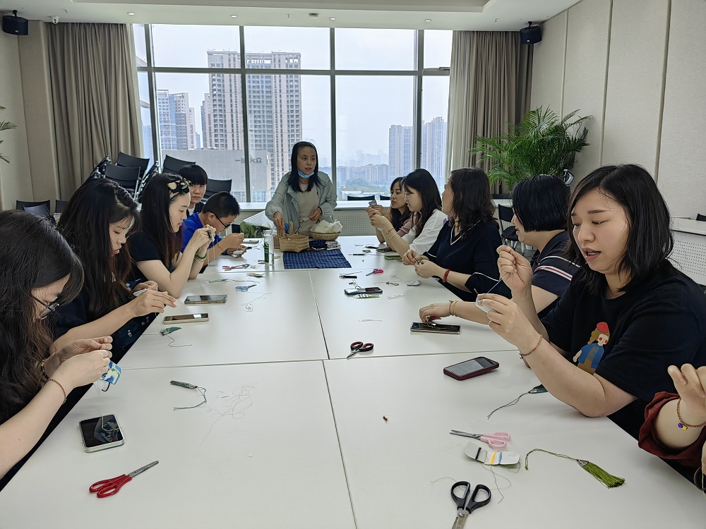 活動共分為兩個環節,第一個環節是趣味手作即手工縫制端午香包,授課老師是天府新區專門從事公益活動教學的月亮老師。為了便于大家更好、更快地熟悉縫制手法,老師先教大家制作了簡單的五彩手鏈,算是活動開始前的熱身環節,但是因為大家平日里手工活接觸不多,一條小小的手鏈也難倒了不少人。端午香包相比起來工序就要繁瑣很多,從吊繩固定,到七字形邊線縫制,再到裝羊毛、香料以及羊毛的再次填充,以及后續的邊線縫合和流蘇固定等,每一步都很考究。值得肯定的是,盡管過程很難,但每一個人都學得很認真,尤其是現場參與的小朋友,在自身的努力堅持下,最終都完成了作品,可謂成就感滿滿。