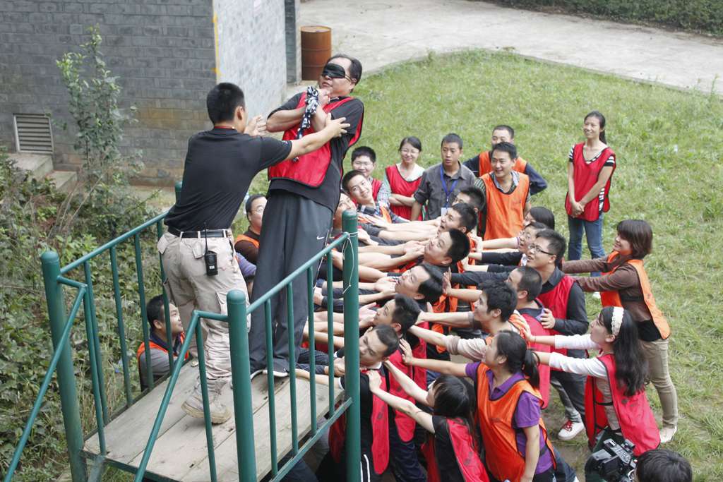 一個具有62年悠久歷史、迄今經久不衰的拓展項目;團隊中的每一個人都有機會站在1.5米高的臺面上,身體直立地向后倒下,倒落在下面隊友的懷抱或雙臂中。經過前面兩個科目的熱身已經能夠保證整個活動非常熱烈而完整的完成,打破了團隊成員間的隔膜,增進了同事之間的情感交流。雖然從未敢于背向自己的眼睛,直直的倒下,心里忐忑不安是難免的,為了證明自己有克服心里畏懼的勇氣,與要相信團隊的安全,我還是站在1.5米的高臺上,把我的小性命交于了團隊,并嚴格按照培訓師的要求,規范自己的行為,以免自己的失誤造成隊友的傷害。