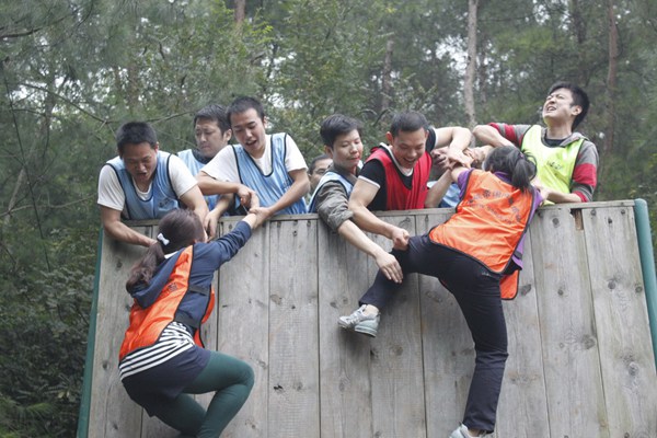 全體成員要在規定的時間內翻越一面4.2米的光滑的墻面,在此過程中,大家不能借助任何外界的工具,包括衣服、皮帶、繩子等。所能用的資源只有每個人的身體。當培訓師講完這個科目的要點時,我看著這堵4.2米的高墻,心里困惑這怎么可能上去呢?豈料,隊伍中已經快速計劃、組織、協調力量,密切合作起來,神速般的達成了默契,兩位隊友很快翻越高墻,并招手迎接新的攀登者。將這看似不可能完成的任務變成了現實,這些高高在上的“純爺們”,戰勝困難的決心和信心,讓我們心生贊美。大家的團結一致,并沒有落下任何隊員。